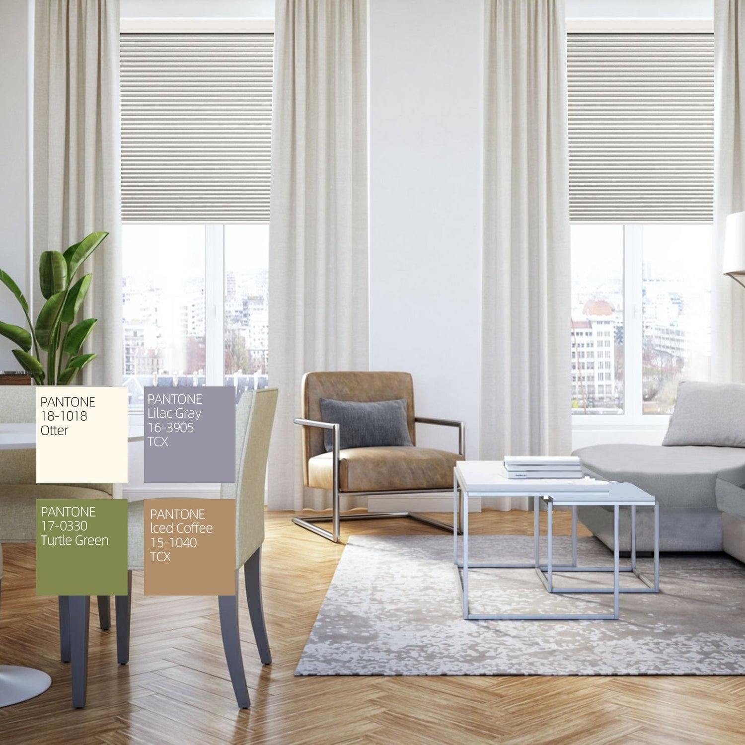 Step into a realm where Pantone’s Otter and Turtle Green bring the outside in, creating an organic and chic harmony in this contemporary space. Accents of Lilac Gray and Iced Coffee introduce a layer of sophisticated neutrality, while shades in complementary tones offer a sleek backdrop and functional elegance. This ensemble showcases a mindful curation of home decor, where the colors of the furniture and the shades collaborate for a look that’s both modern and timeless.