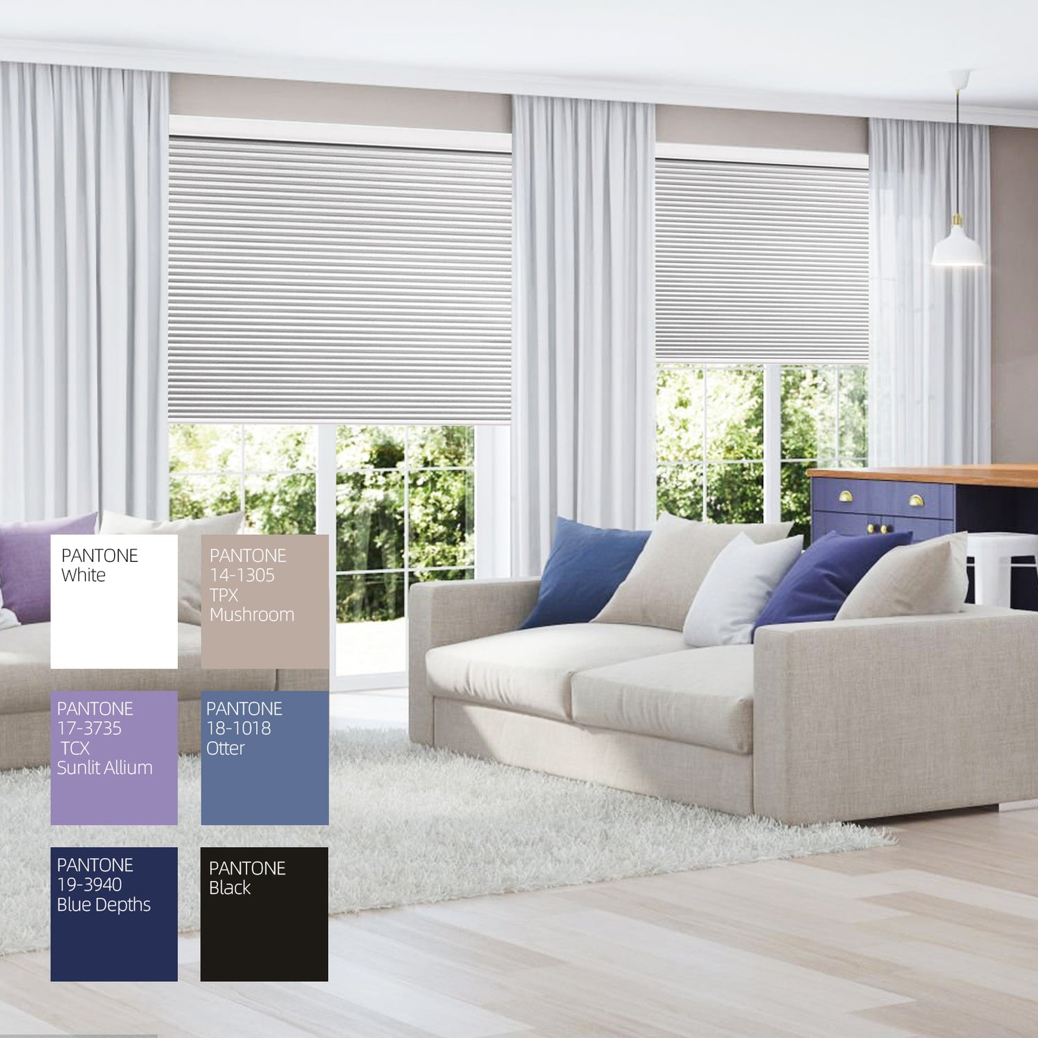 Infuse your living space with the tranquility and modern elegance of Pantone's color palette, as showcased in this exquisite setting. The gentle blend of Pantone White and Mushroom brings a soothing balance to the room, punctuated by the deeper tones of Blue Depths and Otter for a touch of sophistication. Shade Revolution’s motorized shades complement these colors with their sleek functionality and stylish presence, enhancing the aesthetic while offering practical, effortless light control.